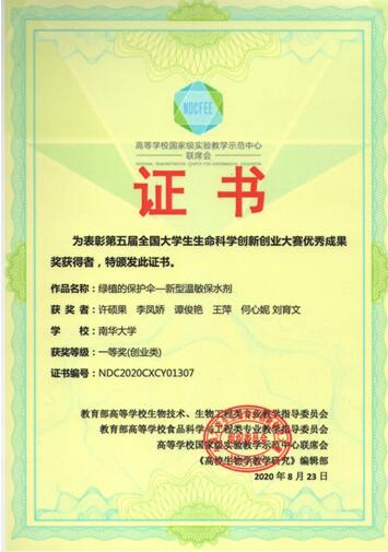 近日,由教育部高等学校生物技术、生物工程类专业教学指导委员会,教育部高等学校食品科学与工程类专业教学指导委员会,高等学校国家级实验教学示范中心联席会,《高校生物学教学研究》(电子版)编委会,全国大学生生命科学创新创业大赛组织委员会联合主办的第五届全国大学生生命科学创新创业大赛圆满落下帷幕。PA视讯集团官网“生物医用水凝胶大学生创新团队”成员许硕果、李凤娇、谭俊艳、王萍、何心妮和刘育文等同学完成的《绿植的保护伞——新型温敏保水剂》项目荣获创业组一等奖,指导教师刘阳博士获得指导教师一等奖。