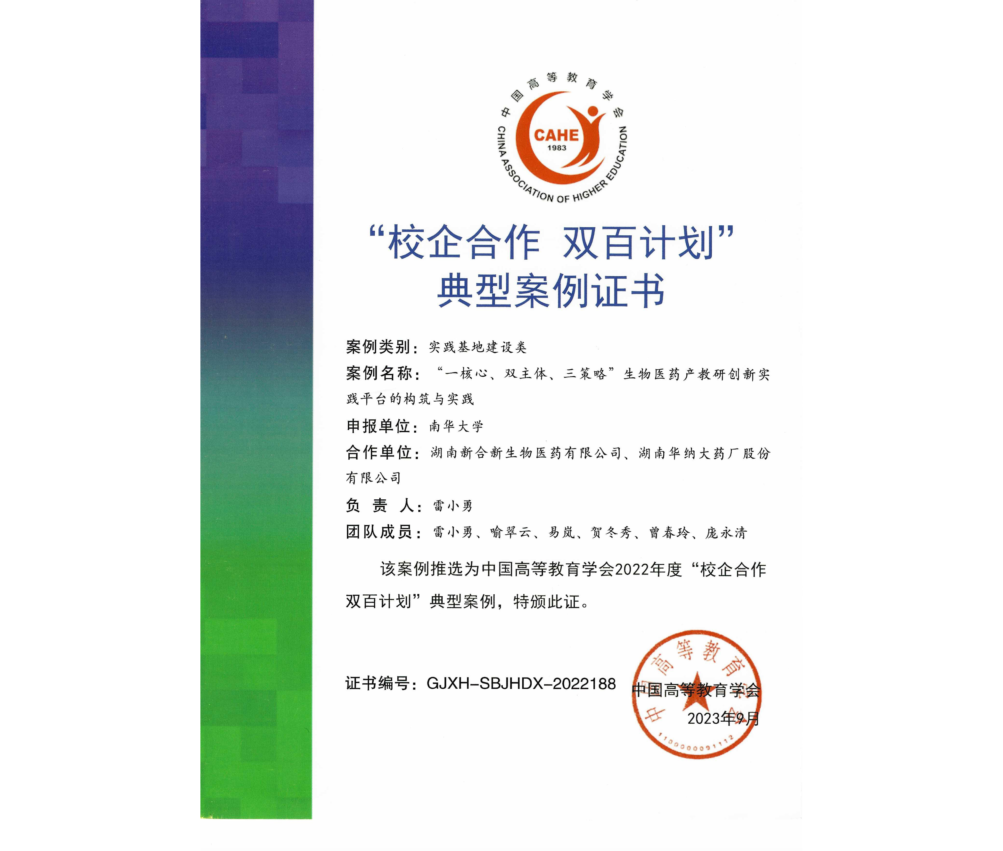 近日,中国高等教育学会公布了2022年度中国高等教育学会“校企合作双百计划”典型案例名单,PA视讯集团官网联合湖南新合新生物医药有限公司,湖南华纳大药厂股份有限公司申报的《“一核心、 双主体、 三策略”生物医药产教研创新实践平台的构筑与实践》成功入选实践基地建设类典型案例。该案例负责人为雷小勇教授,成员有喻翠云、易岚、贺东秀、曾春玲和庞永清等。PA视讯集团官网党委书记袁中华应邀参加中国高等教育学会“校企合作 双百计划”典型案例研讨会并领奖。