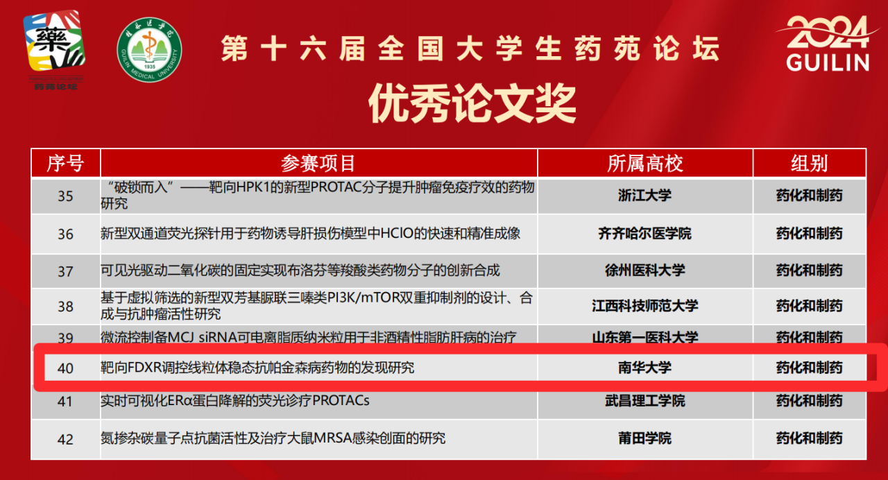 自药苑论坛启动以来,PA视讯集团官网高度重视,经过严格遴选、师生精心备赛,最终,夏旖妞、张铭、潘思纯、王舟、肖艺同学申报的项目《Ang-1l诱导H9c2心肌细胞肥大过程中罗丹酶的变化及硫代硫酸钠的治疗作用》(指导教师:谢志忠)荣获药理学组创新成果三等奖;杨雅雯、骆威、张苗、关沐澜、曾羡麟同学参赛的论文《靶向FDXR调控线粒体稳态抗帕金森病药物的发现研究》(指导教师:王震、彭雪)荣获药化和制药组优秀论文奖。