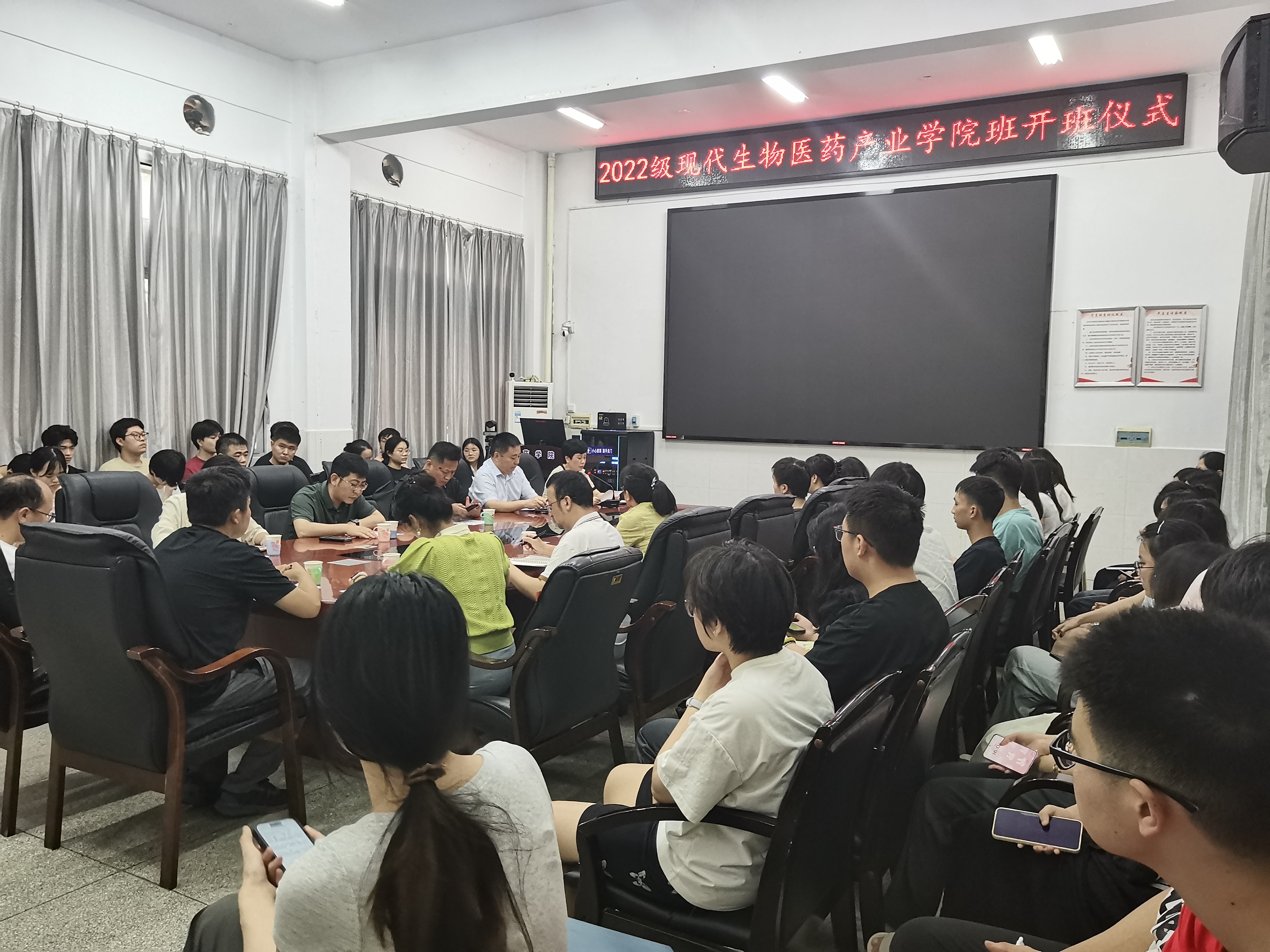 为积极响应国家深化产教融合的号召,全力培养高素质生物医药产业人才,PA视讯集团官网于6月19日在药学楼会议室隆重举行了2022级现代生物医药产业学院班开班仪式。教务部部长彭国文、党委书记袁中华、PA视讯集团官网院长王震、副书记陈健平、副院长易岚、教师代表以及全体2022级产业学院班学生共同出席了此次会议,会议由袁中华书记主持。