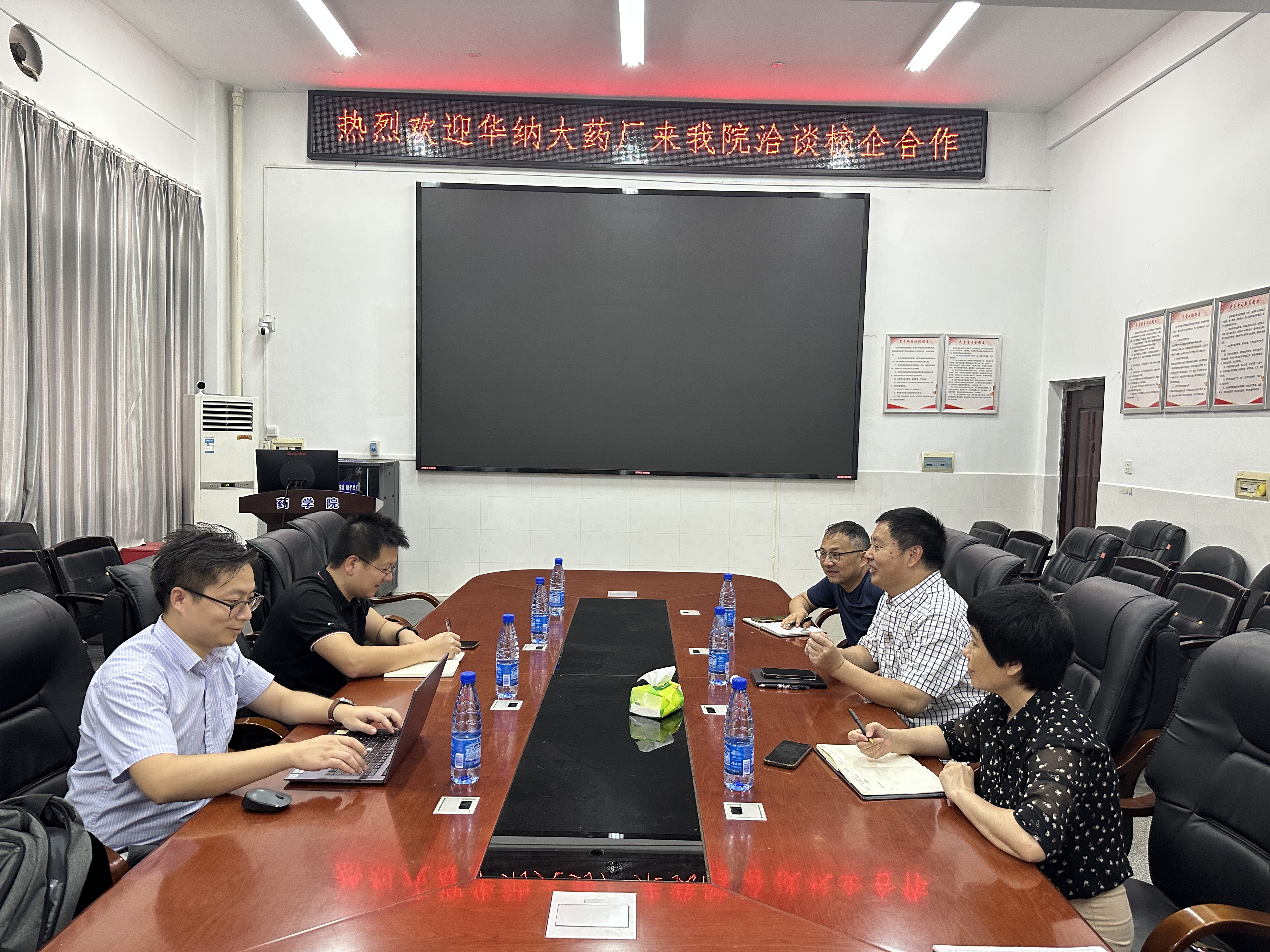 为推动现代生物医药产业学院发展,共谋校企合作双赢的良好局面,2023年8月11日下午,湖南华纳大药厂股份有限公司(以下简称华纳大)人资负责人张品、蒋兴等一行来我院洽谈合作相关事宜。PA视讯集团官网党委书记袁中华、副院长易岚、教务办虞佳、教研室老师唐国涛和辅导员彭翔参加了座谈会。