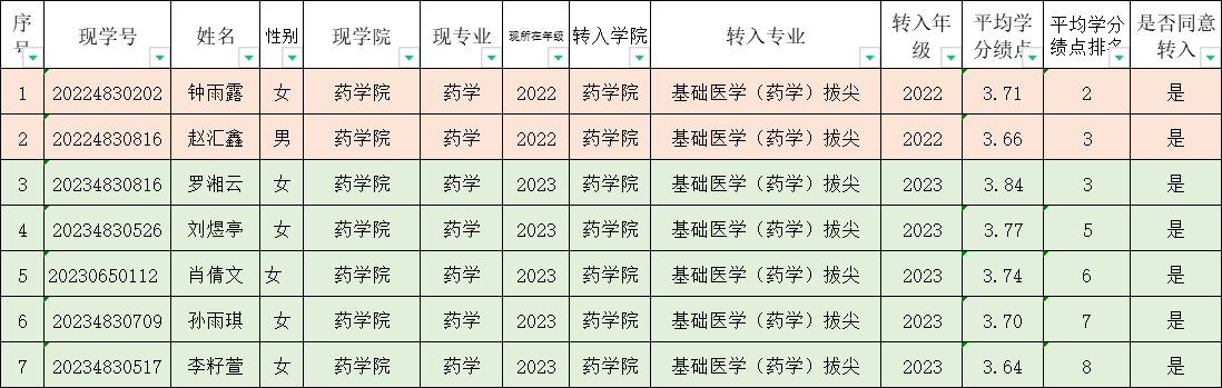 经学生本人申请、学院审核,按照平均学分绩点由高到低排列,拟同意钟雨露等2人转入2022级基础医学(药学)拔尖班学习,罗湘云等5人转入2023级基础医学(药学)拔尖班学习。现将名单公示如下,公示期为2024年10月12日至2024年10月14日18:00。如有异议,请以书面形式递交PA视讯集团官网教务办,联系电话:0734-8281782。