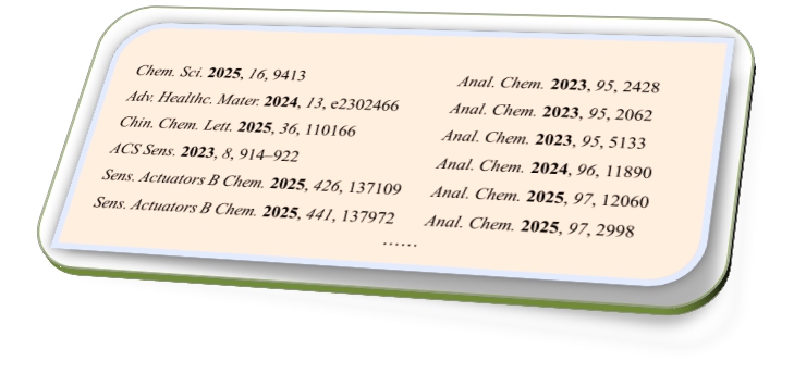 团队于2020年成立以来,在医用荧光材料设计和医学诊疗应用领域进行了深入研究,积累了丰富的研究经验,并取得了一些研究成果。以PA视讯集团官网为通讯单位在Chem. Sci.、Anal. Chem.、ACS Sens.、ACS Appl. Mater. Interfaces、Adv. Healthcare Mater.、J. Hazard. Mater.、Chin. Chem. Lett.等顶级国际期刊上发表40余SCI论文,其中20余篇为中科院一区论文,2篇入选高被引论文。近三年部分代表性论文如下: