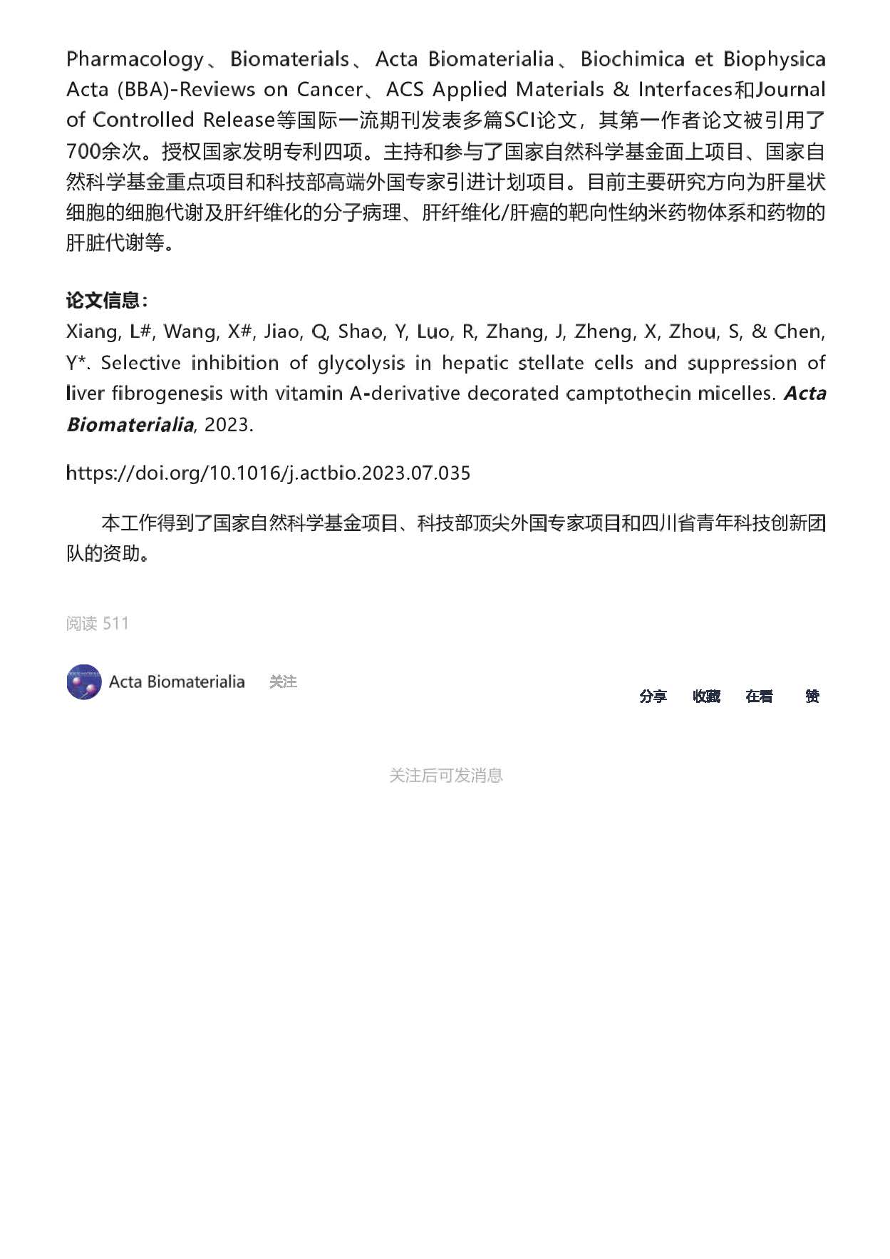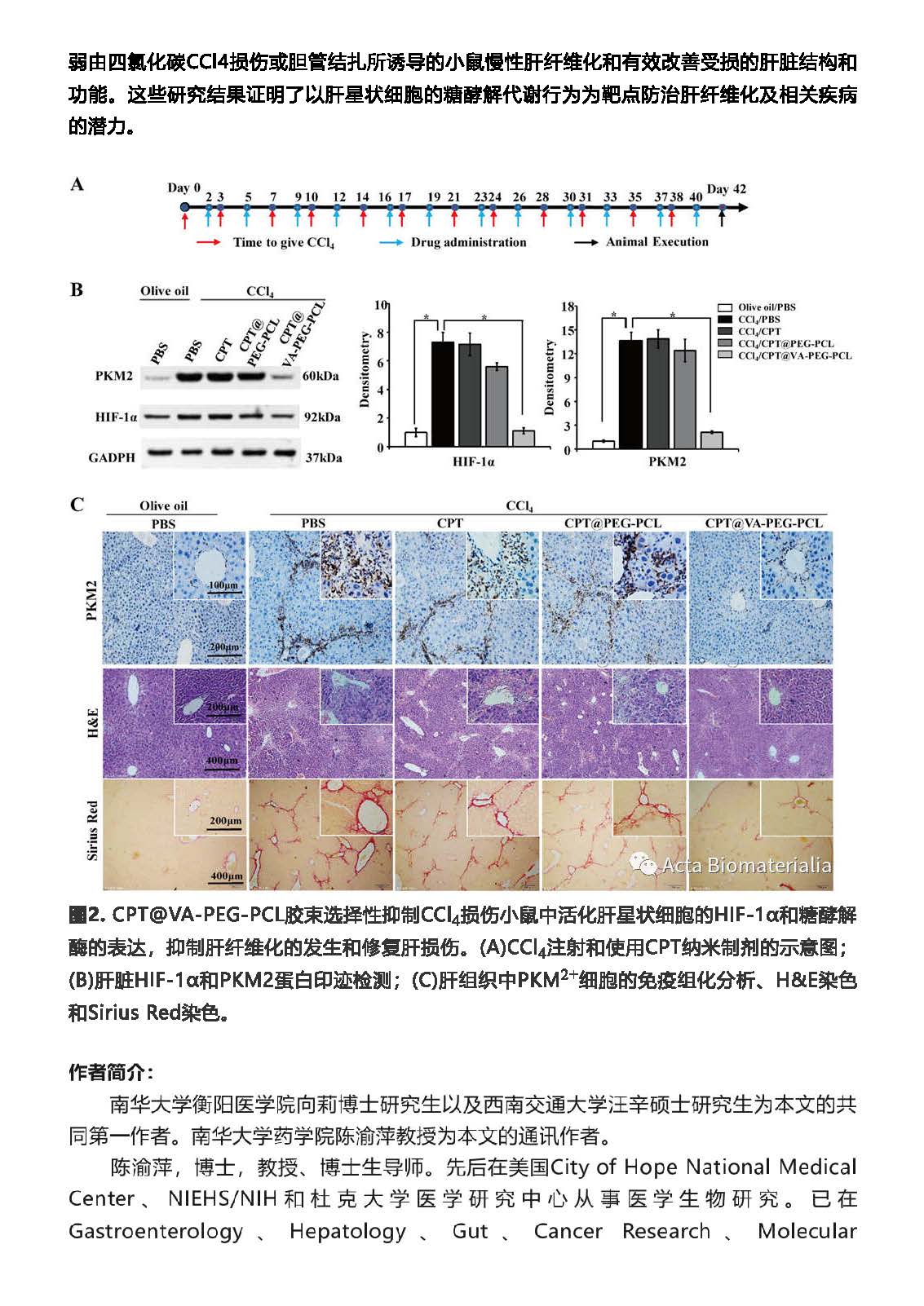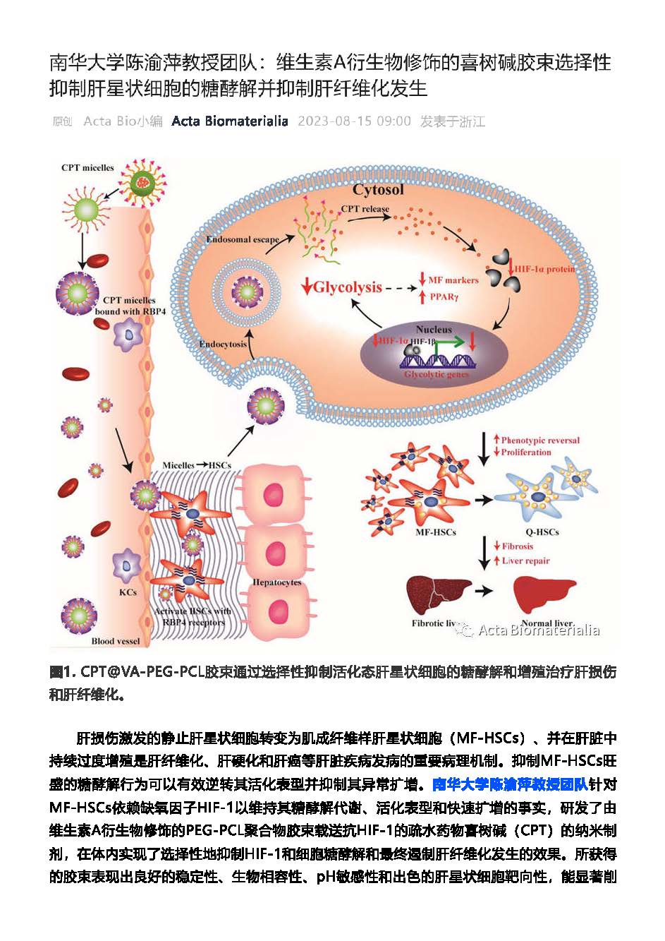 PA视讯集团官网高层次人才陈渝萍教授所带领的团队在Acta Biomaterialia期刊发表“维生素A衍生物修饰的喜树碱胶束选择性抑制肝星状细胞的糖酵解并抑制肝纤维化发生”学术论文。