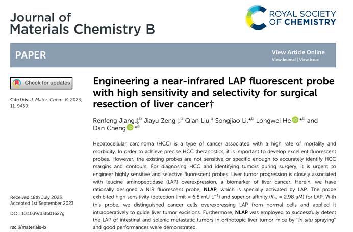肝细胞癌(HCC)是一种与高死亡率和发病率相关的癌症。为了实现精确的HCC治疗诊断,开发优异的荧光探针非常重要。然而,现有的探头不够灵敏或特异,无法准确识别HCC的边缘和轮廓。为了诊断HCC并在手术期间识别肿瘤,迫切需要设计高灵敏度和选择性的荧光探针。肝脏肿瘤的进展与亮氨酸氨肽酶(LAP)过度表达密切相关,LAP也是肝癌的生物标志物。在此,我们合理设计了一种由LAP特异性激活的NIR荧光探针NLAP。该探针表现出LAP高灵敏度(检测限= 6.8 mU/L)和优异的亲和力(Km=2.98 μM)。通过NLAP,我们将过度表达LAP的癌细胞与正常细胞区分开来,并在术中应用它来指导肝脏肿瘤切除。此外,NLAP还通过“原位喷洒”成功检测原位肝肿瘤小鼠肠和脾转移瘤LAP,并表现出良好的性能。这一成果以“Engineering a near-infrared LAP fluorescent probe with high sensitivity and selectivity for surgical resection of liver cancer”为题于9月1日在线发表Journal of Materials Chemistry B上。PA视讯集团官网硕士研究生江仁峰和基础医学院博士研究生曾佳玉为本文的共同第一作者,PA视讯集团官网何隆薇教授、青年教师李宋娇与PA视讯集团官网附属南华医院程丹教授为本研究论文的共同通讯作者。PA视讯集团官网和附属南华医院为通讯单位。文章链接:https://doi.org/10.1039/d3tb01627g。