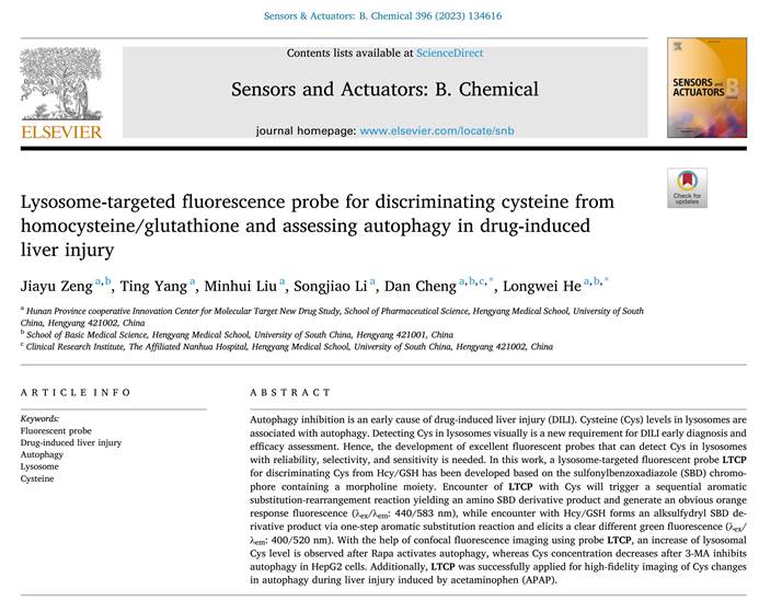 自噬抑制是药物性肝损伤(DILI)的早期原因。溶酶体中的半胱氨酸(Cys)水平与自噬相关。可视化检测溶酶体中的Cys是DILI早期诊断和疗效评估的新要求。因此,需要开发能够可靠、选择性和灵敏地检测溶酶体中Cys的优异荧光探针。在这项工作中,基于含有吗啉部分的磺酰基苯并恶二唑(SBD)荧光团,开发了一种用于区分Cys和Hcy/GSH的溶酶体靶向荧光探针LTCP。LTCP与Cys相遇会引发连续的芳香族取代重排反应,生成氨基SBD衍生产物,并产生明显的橙色响应荧光(λex/λem: 440/583nm),而与Hcy/GSH相遇时,通过一步芳香取代反应形成SBD衍生产物,并引发明显不同的绿色荧光(λex/λem: 400/520 nm)。在使用探针LTCP的共聚焦荧光成像的帮助下,在Rapa激活自噬后观察到溶酶体Cys水平增加,而在3-MA抑制细胞自噬后溶酶体Cys浓度下降。此外,LTCP还成功应用于对乙酰氨基酚(APAP)引起的肝损伤期间自噬过程Cys变化的高保真成像。该成果以“Lysosome-targeted fluorescence probe for discriminating cysteine from homocysteine/glutathione and assessing autophagy in drug-induced liver injury”为题于9月12日在线发表在Sensors and Actuators B: Chemical。PA视讯集团官网基础医学院曾佳玉为本文第一作者。PA视讯集团官网何隆薇教授与附属南华医院程丹教授为本研究论文的共同通讯作者。PA视讯集团官网和附属南华医院为通讯单位。文章链接:https://10.1016/j.snb.2023.134616。