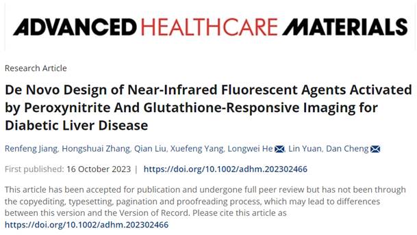 糖尿病及其并发症,如糖尿病肝病,已成为困扰人们健康的重大问题。对其病理过程中氧化还原状态的检测可以有效地帮助我们对疾病有更深入的了解。一对氧化还原物质过氧亚硝酸根离子(ONOO-)和谷胱甘肽(GSH)被认为与其发生发展密切相关。因此,ONOO-和GSH在糖尿病肝病中的直接可视化对于在分子水平上评估疾病至关重要。在此,我们基于近红外荧光团的羟基和氨基,通过保护与脱保护策略,制备了两种可激活的探针NTCF-ONOO-和NTCF-GSH,用于选择性检测ONOO-和GSH。观察了外源性和内源性ONOO-和GSH在活细胞和体内的动态荧光成像。重要的是,本研究可视化了糖尿病肝病细胞模型中的ONOO-和GSH水平,并探讨了该过程中与NAD+/NADH相关的可能的氧化还原失衡机制。此外,这两个探针可以灵敏地识别由链脲佐菌素和链脲佐菌素/对乙酰氨基酚诱导的糖尿病肝损伤引起的氧化应激过程中ONOO-和GSH含量的动态变化。此外,这些探针还可有效监测糖尿病患者的临床血清样品。这项工作将极大地促进与氧化应激事件相关的临床糖尿病肝脏疾病早期检测的发展。这一成果以“De Novo Design of Near-Infrared Fluorescent Agents Activated by Peroxynitrite and Glutathione-Responsive Imaging for Diabetic Liver Disease”为题于10月16日在线发表在Advanced Healthcare Materials。PA视讯集团官网硕士研究生江仁峰和附属南华医院青年教师张红帅为共同第一作者,PA视讯集团官网何隆薇教授和附属南华医院程丹教授为本研究论文的共同通讯作者。PA视讯集团官网衡阳医学院PA视讯集团官网和附属南华医院为通讯单位。文章链接:https://doi.org/10.1002/adhm.202302466。