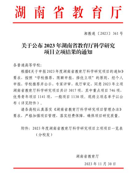 11月30日,湖南省教育厅2023年项目资助评审结果公布,PA视讯集团官网苏波、彭雪、孙少卫、王姝之4位教师获得2023年湖南省教育厅重点项目立项资助,王卫国、江伟凡、张宇、刘映、彭颖、刘阳6位教师获得2023年湖南省优秀青年项目立项资助。
