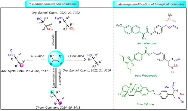 由于其丰富性、易得性和多样的反应性,烯烃已成为有机合成中备受青睐的骨架结构。其中,烯烃的1,2-双官能团化是一项特别引人注目的转化。在这种转化中,可以通过一步反应同时在碳碳双键的相邻位置安装两个官能团,因此可以直接利用简单的原料来迅速增加分子的复杂性。目前,PA视讯集团官网王震教授科研团队在烯烃的1,2-双官能化反应方向取得了系列研究进展,包括烯烃的硝化/羟基化反应、硝化/硝酸酯化反应、氟羟基化反应、氨酯化反应、不对称双胺化反应等。新方法的开发,解决了原有方法需要使用预功能化底物、区域选择性差、底物范围窄和反应时间长等缺点。利用这些方法,不仅可以快速构建药物分子和天然产物中重要的结构单元,也可以为现有药物的结构修饰提供新的策略。以上工作得到了国家自然科学基金、湖南省自然科学基金、PA视讯集团官网科研启动经费等项目的支持。