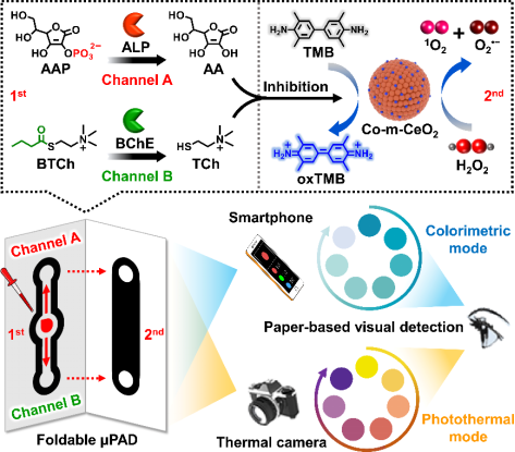 图1.可编程μPADs用于ALP和BChE比色和光热检测示意图