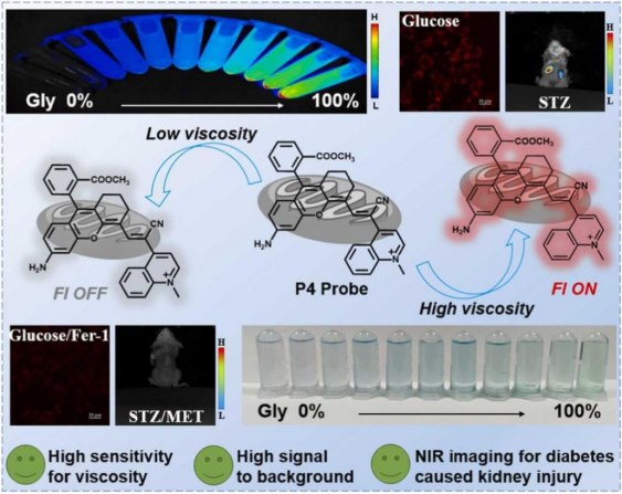 糖尿病肾损伤已成为导致肾脏疾病的重要原因之一。早期发现和干预可以有效延缓肾脏疾病的发展。粘度作为细胞微环境的关键参数,在维持线粒体功能和细胞稳态中起着关键作用,其失调与糖尿病肾损伤的发病机制密切相关。然而,很少有报道使用荧光探针来确定糖尿病肾损伤过程中的线粒体粘度变化。在此,该团队使用“渐进优化”策略开发了一种基于半花菁的近红外荧光探针P4,能够对肾细胞和体内线粒体粘度变化进行靶向成像。P4探针对粘度具有高灵敏度和选择性,在具有高线性关系的高粘度环境中表现出约146倍的信号增强。P4的荧光量子产率从PBS(低粘度)中的< 0.001增加到90%甘油(高粘度)中的0.12。此外,P4探针显示出优异的线粒体定位效率,能够在糖尿病肾损伤进展和治疗干预期间实时监测线粒体粘度变化。P4探针在糖尿病肾损伤小鼠模型中检测到肾脏粘度变化,与健康组照相比,信号强度增加了1.5倍。使用P4探针,首次在高葡萄糖诱导的肾细胞损伤模型中观察到粘度变化与铁死亡相关。这项工作将为更深入地了解肾脏疾病的粘度变化提供有意义的工具,并有望促进肾脏疾病的早期诊断和治疗。相关研究成果以“Fabricating a mitochondrial viscosity-activated fluorescent probe for highly sensitive imaging of kidney injury in vivo”为题发表在国际权威期刊《Sensors and Actuators B: Chemical》(中科院一区TOP期刊,影响因子8.0);本项工作由团队硕士生郑显贵和助理研究员张红帅博士为共同第一作者完成,PA视讯集团官网附属南华医院程丹研究员和PA视讯集团官网何隆薇教授为本文通讯作者。
