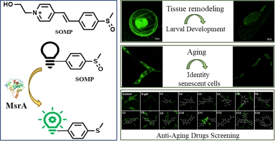 细胞增殖与衰老是密切相关的生物学过程,在组织重塑、应激反应及衰老相关疾病中扮演着双重角色。然而,细胞衰老的动态复杂性使得传统检测方法难以实现活细胞内生物标志物的原位精准监测,导致关键生物学信息丢失。研究表明,MsrA活性降低会缩短秀丽隐杆线虫、果蝇、小鼠等多种模式生物的寿命,而提高其表达水平则可延缓衰老并促进健康寿命。因此,MsrA被视为调控细胞衰老的关键分子靶点。为此,研究团队设计了由苯乙烯基吡啶鎓染料和亚砜基团构成的特异性MsrA荧光探针SOMP。该探针具有超高灵敏度(检测限达8.9 ng/mL)、优异的选择性(受MsrB2/B3干扰极小)和低细胞毒性的优势,适用于细胞长期观测。基于SOMP的卓越性能,该研究实现了多项创新应用:1)原位监测细胞增殖与幼体发育:首次在活细胞及模式生物中动态可视化MsrA活性变化。2)精准评估衰老进程:在多种衰老模型中成功追踪MsrA的活性变化,为衰老机制研究提供新方法。3)高通量抗衰老药物筛选:利用SOMP首次发现姜黄素的抗衰老作用可能与MsrA介导的氧化还原信号相关,为天然抗衰老药物开发提供新线索。该研究开发的SOMP探针突破了传统检测技术的局限,为细胞衰老的原位分析、衰老相关疾病机制探索及抗衰老药物开发提供了高效、可靠的新工具,有望为精准医学与衰老相关领域提供无创原位可视化新方法。该成果以“A Novel Visual Perspective for Tracking of Larval Development, Aging and Anti-Aging Drugs Screening by Fluorescent Sensing MsrA”为题发表于国际权威期刊《Analytical Chemistry》(中科院一区TOP期刊,影响因子6.8);该研究由团队博士研究生曾佳玉、PA视讯集团官网硕士研究生杨婷作为共同第一作者完成,PA视讯集团官网附属第一医院周佳主任、附属南华医院程丹研究员和PA视讯集团官网何隆薇教授为通讯作者。