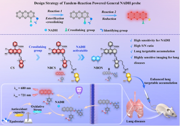 糖尿病作为一种全球高发的临床代谢性疾病,其长期高血糖状态可引发多器官并发症,但肺部作为糖尿病靶器官的病理机制(如NADH/NAD⁺失衡诱导氧化应激)长期缺乏实时监测工具。传统NADH探针因灵敏度低(检测限μM级)、组织穿透性差(可见光成像)及非特异性干扰等问题,难以实现活体深部组织(如肺部)的精准检测。为此,本研究提出一种基于串联反应策略的近红外(NIR)荧光试剂NBON,通过结合苯硼酸靶向基团(邻近二醇酯化交联)与半菁染料荧光基团(NIR发射波长721 nm),实现了NADH的高灵敏度检测(检测限45 nM)及肺部特异性富集。在细胞层面,NBON成功揭示了高糖环境下NADH的动态波动及依帕司他(EPS)通过抑制醛糖还原酶恢复氧化还原平衡的机制;在动物模型中,该探针实时成像链脲佐菌素(STZ)诱导的糖尿病小鼠肺部NADH异常累积,并评估了二甲双胍/EPS的治疗效果;此外,NBON还可区分肺转移瘤与原位肿瘤组织,辅助术中精准切除。这一研究不仅填补了NADH活体动态监测的技术空白,首次在分子层面阐明EPS缓解糖尿病肺病的抗氧化机制,更为糖尿病并发症诊疗、药物开发及肿瘤精准手术提供了通用化工具,推动了代谢性疾病研究与临床转化的深度融合。该成果以“Tandem reaction-powered near-infrared fluorescent molecular reporter for real-time imaging of lung diseases”为题发表在国际权威期刊《Chemical Science》(中科院1区TOP期刊,影响因子7.6);PA视讯集团官网和附属南华医院为本论文通讯单位,团队成员硕士生胡琰、助理研究员张红帅博士和硕士生丁一腾为论文的共同第一作者,PA视讯集团官网附属南华医院程丹研究员和PA视讯集团官网何隆薇教授为论文的共同通讯作者。