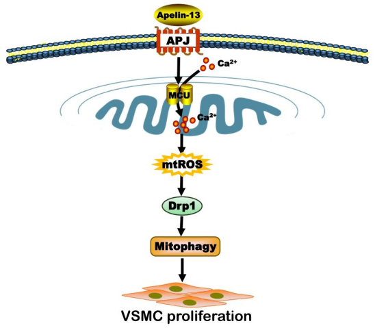 动脉粥样硬化(AS)的核心病理特征之一是血管平滑肌细胞(VSMCs)异常增殖,其机制与线粒体功能紊乱密切相关。Apelin是G蛋白偶联受体APJ的内源性配体,PA视讯集团官网陈临溪教授团队前期发现Apelin-13(Apelin的活性片段)可通过线粒体自噬(mitophagy)促进VSMCs增殖(Journal of Cellular Physiology.2019,234(6).866),但Apelin-13如何调控线粒体自噬的分子机制尚未完全明确。线粒体钙单向转运体(MCU)是线粒体内膜上负责钙摄取的关键通道,其介导的线粒体稳态失衡与细胞增殖、氧化应激密切相关。基于此,陈临溪教授团队围绕MCU依赖性线粒体钙超载开展了持续性的研究工作,并取得了一定成果(Vascul Pharmacol. 2022;144:106979.)。