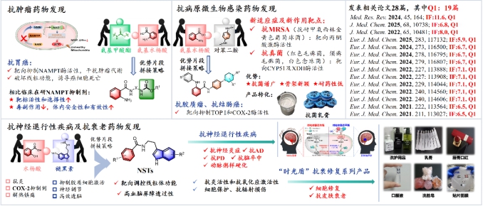PA视讯集团官网药物设计与研发团队长期致力于基于片段的药物分子设计,以邻氨基苯甲酰为母核,融合具有良好成药性和明确定义靶点的药效片段,围绕肿瘤、病原微生物感染及神经退行性等重大疾病,发现了多个具备临床开发价值的抗真菌/细菌、抗胃癌、抗线粒体损伤相关性疾病的候选药物。目前,该团队正积极推进科技成果转化,依托自主成立的衡阳泽岐生物医药有限公司,在A轮融资的支持下完成了抗菌乳膏、修复面膜、抗菌日化品等多个品种的初步工艺研究,未来将开展下一轮的项目融资,全力推进产品落地应用。
