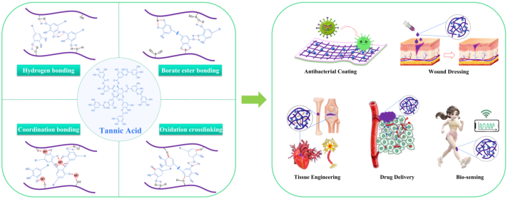 该论文在团队的研究基础上,系统总结了TA参与水凝胶构建的主要交联方式,包括氢键交联、硼酸酯键交联、配位交联和氧化交联等,综述了其在抗菌涂层、伤口敷料、组织工程、药物递送、生物传感等生物医学领域中的代表性进展,为深入推动单宁酸在水凝胶中的应用和产品开发奠定了基础。