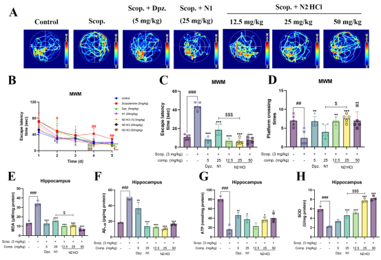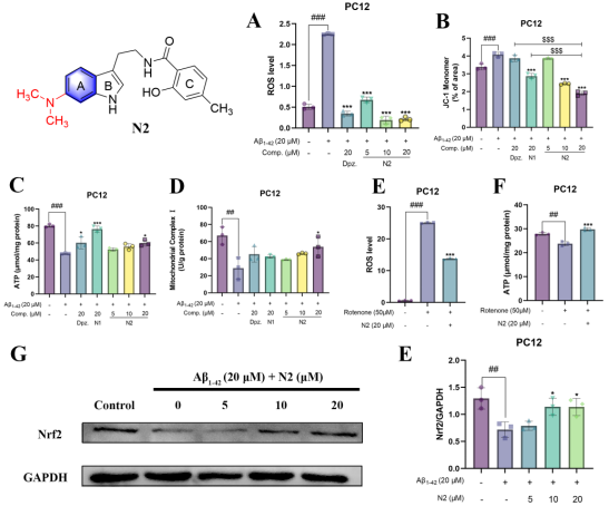 化合物N2是NSTs中筛选出的最优化合物,我们以AD(第一大神经退行性疾病)为切入点进行分子机制探索。结果表明,化合物N2可上调Nrf2并恢复MCI活性以改善线粒体功能从而治疗AD。在细胞水平上,化合物N2不仅能直接改善线粒体功能——表现为显著提升MCI活性、恢复线粒体膜电位并增加ATP生成,还能降低细胞内ROS、炎症因子TNF-α和IL-6水平,有效缓解线粒体功能障碍引发的氧化应激和神经炎症。值得注意的是,机制研究发现化合物N2可逆转鱼藤酮诱导的MCI功能障碍——减少ROS水平并增加ATP生成,同时表现出对Nrf2蛋白表达的上调作用。在AD动物模型中,化合物N2能显著改善小鼠焦虑情绪和认知障碍,并具有调节东莨菪碱诱导的脑组织神经炎症、氧化应激(MDA降低,SOD活性提升)和能量代谢(ATP生成增加)的能力,同时还能减轻Aβ病理蛋白沉积和神经元损伤。上述结果表明化合物N2具备靶向线粒体功能障碍治疗AD的候选药物潜力,揭示了NSTs治疗NDDs的根本机制在于调控线粒体功能,进一步证实了干预线粒体功能是实现多种NDDs治疗的关键途径。研究结果已发表于ACS Omega (IF = 4.3)。本论文第一作者为PA视讯集团官网硕士研究生曾晶和基础医学院博士研究生赵雨婷。