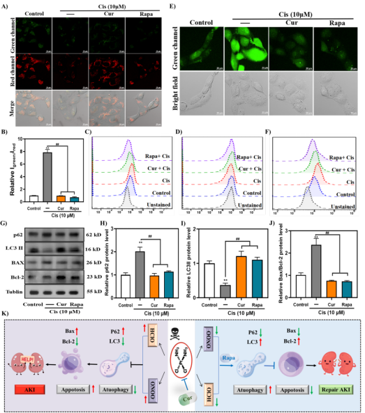此外,KNOP表现出良好的肾清除能力和高成像对比度,成功在小鼠中顺铂诱导的AKI进展及天然药物姜黄素和雷帕霉素治疗干预过程中对ONOO⁻/HClO进行原位可视化成像。更重要的是,KNOP还能有效识别临床血清样本中的肾损伤患者。这些研究结果表明,KNOP是一种有效的、可用于理解硝化/氧化应激及自噬机制的肾清除型工具,同时也强调了ONOO⁻/HClO作为有前景的生物标志物,在AKI早期识别与干预中的潜在价值。