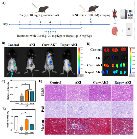 由顺铂(Cis)引起的急性肾损伤(AKI)仍然是临床上面临的一项挑战,常导致不可逆的肾功能衰退。对AKI早期损伤相关的硝化/氧化应激进行原位监测,对于AKI的早期检测以及自噬相关机制的阐明至关重要。针对肾脏内过氧亚硝酸盐(ONOO⁻)/次氯酸(HClO)的靶向检测,可能为AKI的早期诊断和治疗干预提供关键信息。荧光成像因其优异的空间分辨率、灵敏度和无创性,在生物医学领域展现出重要前景。为此,研究团队开发了一种具有肾清除能力的近红外(NIR)荧光探针(KNOP),该探针能够以高灵敏度和快速响应顺序识别ONOO⁻/HClO。这种“顺序锁定”机制有效降低了单一标志物检测带来的假阳性结果。KNOP具有良好的生物相容性,能够灵敏监测AKI诱导及治疗过程中ONOO⁻/HClO的异常变化,并被应用于顺铂诱导的AKI中自噬过程的监测。
