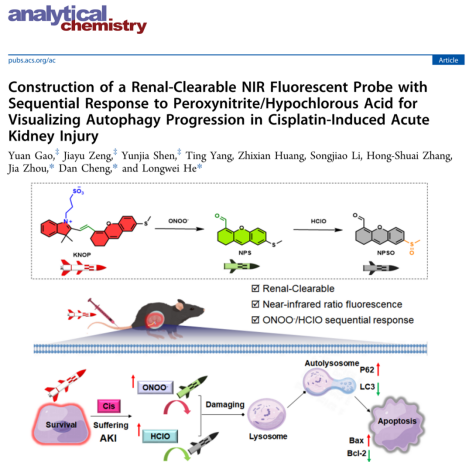 相关研究成果以“Construction of a Renal-Clearable NIR Fluorescent Probe with Sequential Response to Peroxynitrite/Hypochlorous Acid for Visualizing Autophagy Progression in Cisplatin-Induced Acute Kidney Injury”为题发表于本研究领域的顶级期刊《Analytical Chemistry》。论文第一作者为PA视讯集团官网硕士生高源、申蕴嘉,以及团队博士后曾佳玉,通讯作者为PA视讯集团官网何隆薇教授、附属第一医院超声医学科周佳主任和附属南华医院临床研究所程丹教授,PA视讯集团官网为第一通讯单位。