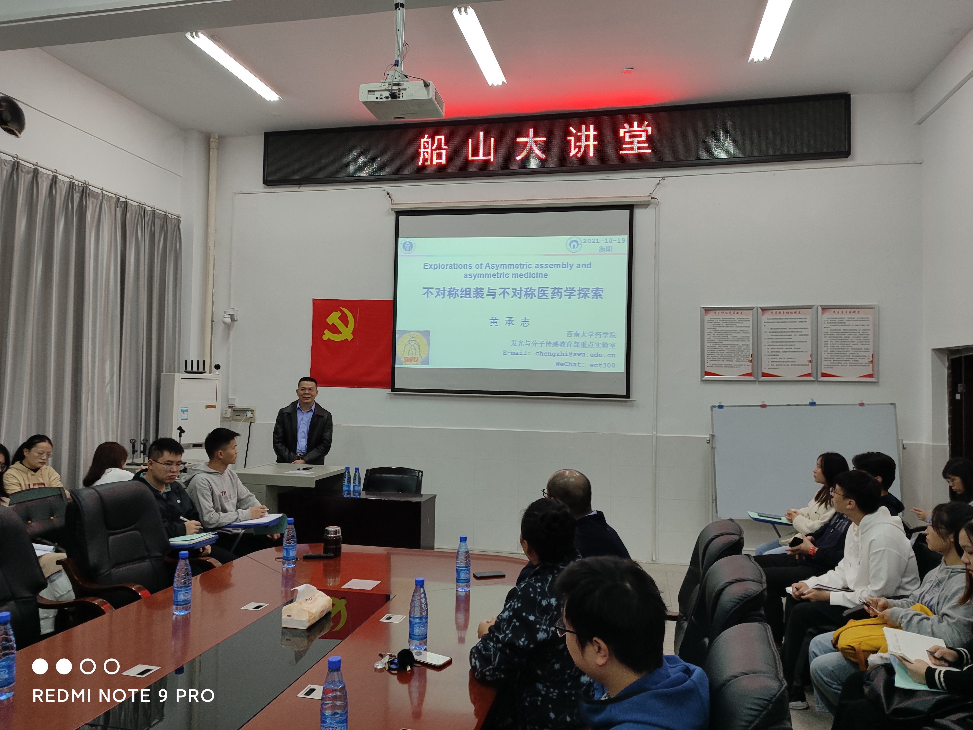 10月19日上午9点,西南大学PA视讯集团官网黄承志教授应PA视讯集团官网科研与学科建设部和PA视讯集团官网的邀请,做客我校“船山大讲堂”学术讲座。黄承志教授在新二教B101会议室做了题为《不对称组装与不对称医学探索》的报告,报告由魏华教授主持。PA视讯集团官网的教师和研究生一同聆听了此次报告。