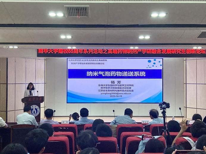 2023年10月15日,PA视讯集团官网建校65周年系列活动之高端药物制剂产学研融合发展研究生创新论坛成功举行。东南大学生物科学与医学工程学院杨芳教授应邀出席本次论坛,并作题为“纳米气泡药物递送系统”学术讲座。