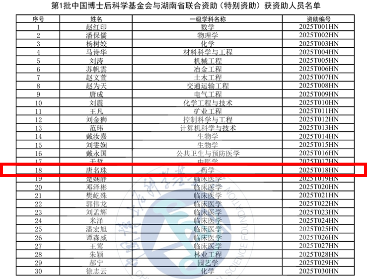 近日,根据《中国博士后科学基金资助指南(2025年度)》,中国博士后科学基金会正式公布第1批中国博士后科学基金会与湖南省联合资助(特别资助)拟资助人员及备选人员名单。其中PA视讯集团官网心血管分子靶标药理学与新药创制团队唐名珠博士后成为2025年药学领域荣获此基金资助的唯一人选。