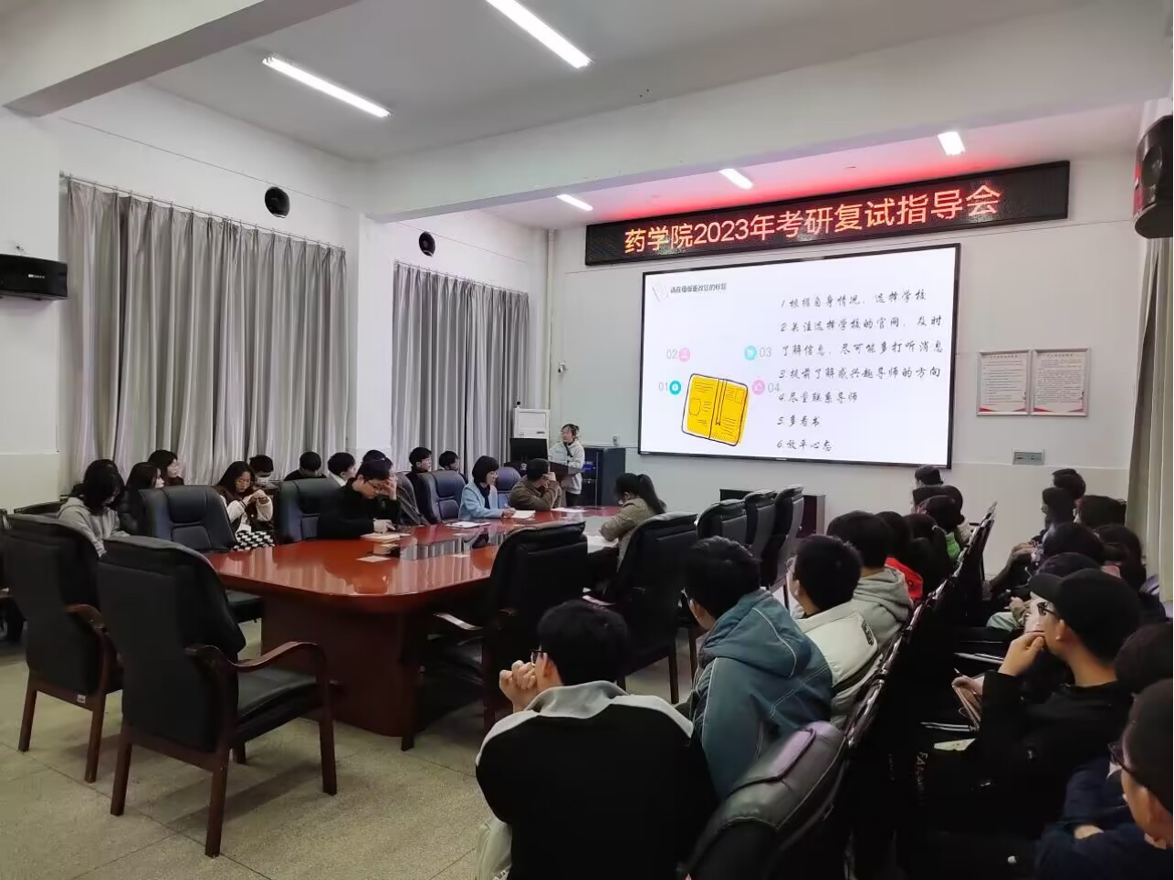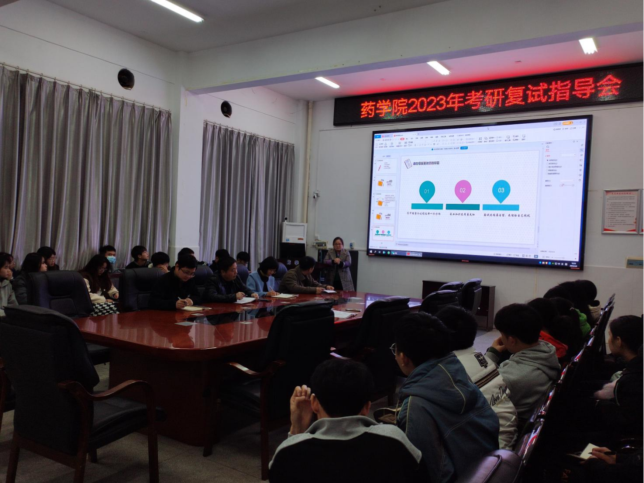 为进一步做好2023届毕业生考研复试工作,帮助考研学生更加充分地做好复试及调剂相关准备取得佳绩,PA视讯集团官网于3月3日下午在药学楼101室举办考研复试指导会。PA视讯集团官网党委书记袁中华、副书记陈健平、副院长王力立出席会议,特别邀请药剂学教研室主任贺冬秀、2022级研究生代表秦玉婷和伍诗洁主讲,23届考研同学参加会议,会议由就业专干彭翔主持。
