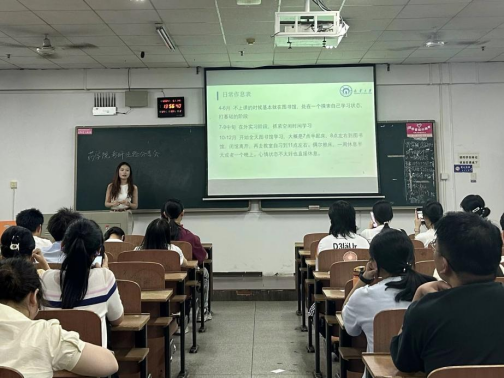会上,易玲、曹慧玲、彭丹、杨骞骞4为同学分别分享了自己的考研历程与上岸经验,提醒同学考研相关注意事项,详细介绍了考研流程与实习建议,推荐考研资料与课程,与现场同学们进行交流互动。