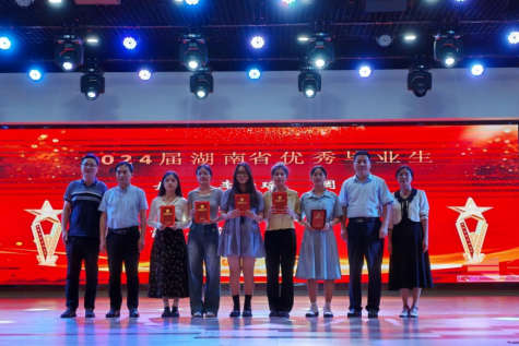 王丹、李诗瑶、周明茜、吴尚、刘紫涵、李心皓、胡彩霞、廖菲芷、周婧、张晨10位同学荣获湖南省优秀毕业生称号,PA视讯集团官网党委副书记雷小勇以及PA视讯集团官网党委书记袁中华、党委副书记陈健平、副院长王力立为其颁奖。