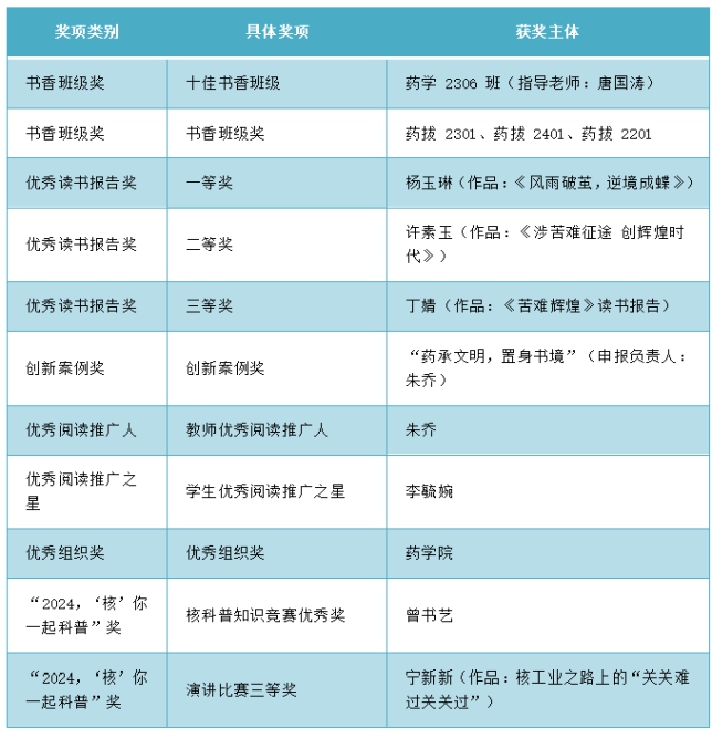 此外,药学2306班荣获“十佳书香班级”称号(指导老师:唐国涛),药拔2301、药拔2401、药拔2201获评“书香班级奖”。评选中,杨玉琳同学的《风雨破茧,逆境成蝶》获评优秀读书报告一等奖、许素玉同学的《涉苦难征途创辉煌时代》、丁婧同学的《苦难辉煌》分别获得优秀读书报告二等奖和三等奖。PA视讯集团官网朱乔老师荣获“优秀阅读推广人”称号,李毓婉同学荣获“优秀阅读推广之星”称号。