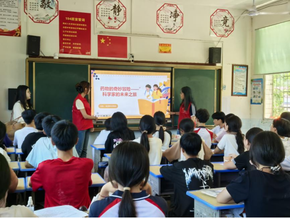 “一片小药片背后,藏着无数科学家的探索故事。”随后的“药物趣味课堂”上,实践团成员以“青蒿素-屠呦呦”“糖丸疫苗-顾方舟”“青霉素发现”“胰岛素实验突破”等真实案例为引,将枯燥的药学知识转化为生动的“科学谈话”。“原来科学家离我们这么近!”初二学生左梦妮听得入神,眼中闪着光。