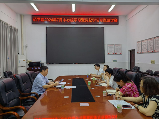 2024年7月5日下午,PA视讯集团官网第7次中心组集中学习暨党纪学习专题研讨会在药学楼B101会议室举行。会议由院党委书记袁中华主持,全体党委委员及综合科主任参加学习会。