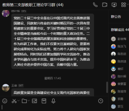 此外,郭勇、徐胜楠、郑治、张宇、王俊等老师也逐一发言。大家一致表示,作为高校教师,我们时刻把全面贯彻党的教育方针,落实立德树人根本任务放心中,在教学上不断探索形式多样、行之有效的教学方法,在科研上敢于创新、打破瓶颈,将科学研究与教学有机融合,努力为国家培养高质量人才。