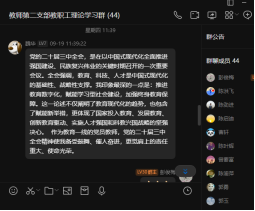 魏华老师在讨论时提出“党的二十届三中全会,是在以中国式现代化全面推进强国建设、民族复兴伟业的关键时期召开的一次重要会议。全会强调,教育、科技、人才是中国式现代化的基础性、战略性支撑。”让他印象最为深刻的一点是:推进教育数字化,赋能学习型社会建设,加强终身教育保障。魏华老师认为这一论述不仅阐明了教育现代化的趋势,也包含了赋能新举措,更体现了国家投入教育、发展教育、创新教育驱动、实施人才强国和科教兴国战略的坚强决心。作为教育一线的党员教师,党的二十届三中全会精神使他备受鼓舞、催人奋进,更觉肩上的责任重大、使命光荣。