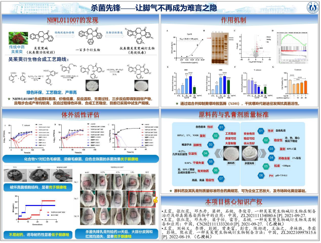 据世界卫生组织数据,浅部真菌感染影响全球20%-25%人口,我国60%以上由红色毛癣菌引起,现有药物存在耐药性强、疗程长等问题。PA视讯集团官网王震教授团队,从传统中药吴茱萸中提取活性成分,经结构改造研发出全新化合物NHWL011007,其乳膏制剂“杀菌先锋”具有起效快(24-48小时快速抑菌)、疗程短(1-2周)、不易耐药等显著优势,体外实验显示对白色念珠菌、红色毛癣菌的杀菌效果优于一线药物酮康唑,且安全性更高。