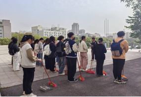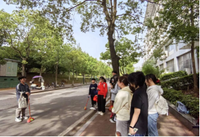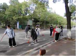 春日暖阳下,学生们手持扫帚等工具,分工协作开展社区服务志愿。他们仔细擦拭宣传栏、认真清理绿化带、有序整理自行车,用实际行动践行“为人民服务”的初心。