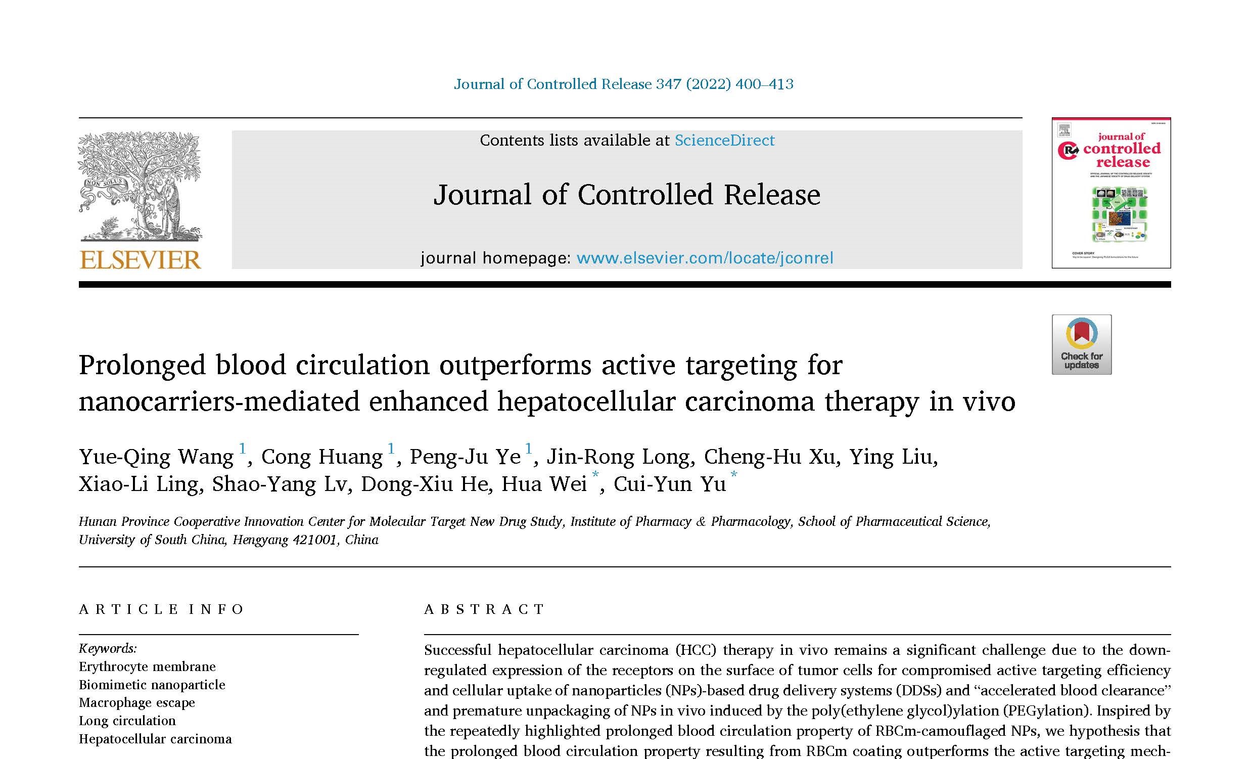 近日,PA视讯集团官网魏华教授和喻翠云教授联合科研团队在药剂学国际一流期刊Journal of Controlled Release(简称JCR,医学1区,TOP期刊,IF:9.776)上发表了题为“Prolonged Circulation Outperforms Active Targeting for Enhanced Hepatocellular Carcinoma Therapy(2022, 347, 400-413.)”的研究论文。该研究通过红细胞膜包裹天然多糖基聚合物前药纳米粒子构筑了仿生纳米载体,在小鼠体内实现了针对肝癌的高效治疗。研究首次揭示了红细胞膜赋予仿生纳米载体的血液长循环性能比纳米载体自身的肝癌细胞主动靶向性能在针对肝癌的体内治疗中发挥着更为重要的作用。仿生纳米载体在大鼠体内的血液循环半衰期(t1/2)是聚合物前药纳米粒子的3倍,是小分子化疗药物阿霉素的3.5倍,因而仿生纳米载体在荷瘤小鼠体内展现了最好的抑瘤效果。该研究为肝癌的临床高效治疗提供了理论指导。PA视讯集团官网硕士研究生汪月琴、黄聪和叶鹏举为共同第一作者,PA视讯集团官网喻翠云教授和魏华教授为共同通讯作者。这是该研究团队在近一年的时间内,连续在JCR上发表的第五篇科研成果。
