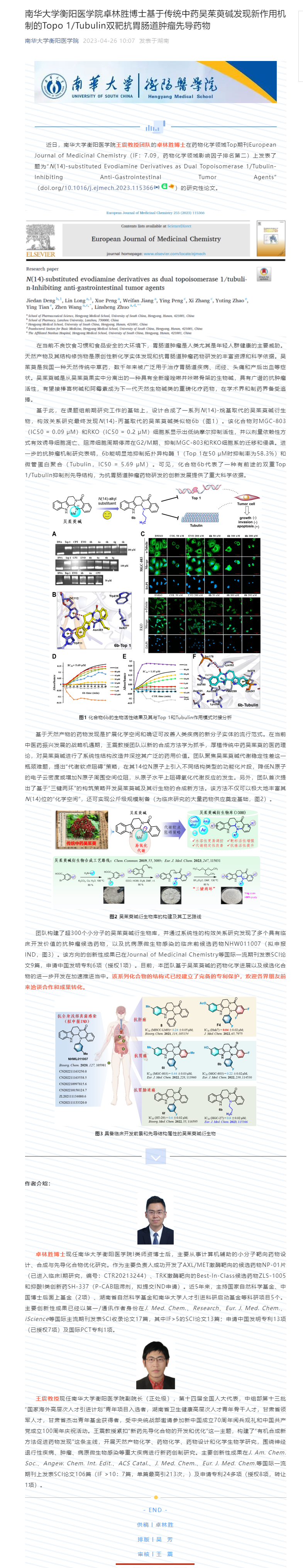 近日,PA视讯集团官网衡阳医学院、肿瘤微环境响应药物研究湖南省重点实验室王震教授团队的卓林胜博士在药物化学领域Top期刊European Journal of Medicinal Chemistry(IF:7.09,药物化学领域影响因子排名第二)上发表了题为“N(14)-substituted Evodiamine Derivatives as Dual Topoisomerase 1/Tubulin-Inhibiting Anti-Gastrointestinal Tumor Agents”(doi.org/10.1016/j.ejmech.2023.115366)的研究性论文。