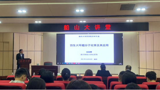 10月24日上午9:30,南方科技大学前沿与交叉科学研究院副研究员杨留攀教授应PA视讯集团官网科研与学科建设部、PA视讯集团官网和衡阳医学院的邀请,做客我校“船山大讲堂”学术讲座。杨教授在医研楼学术报告厅做了题为《仿生大环超分子化学及其应用》的学术报告,本次报告由魏华教授主持。PA视讯集团官网的教师和研究生一同聆听了此次报告。 讲座伊始,杨留攀教授从大环超分子化学诺奖级成就及其现今在分离分析、生物医药等领域的应用入手展开了本次学术讲座的大环超分子主题。他向大家抛出了如何实现大环超分子与生物受体协同作用这一问题。随后他详细且生动地介绍了他在构建可键合阳离子客体的氧杂管芳烃上的研究成果,其具有良好的构象自适应性,选择不同的客体可诱导得到不同的构象。此后,他介绍了通过侧链引入甘醇键构建了水溶性的氧杂管芳烃,其通过主客体键合可实现大环LCST行为的调控。杨教授还向大家介绍了他在构建自适应分子笼时,猜想其是否会带来更好的识别性能,发现实验结果突破常规,其键合常数达到了较好水平,且这些强键具有普遍性。此外,他还做了内修饰空腔设计,制备了酰胺萘管并探究其在气相吸附分离,水相有机污染物去除方面上的应用,结果显示其具有较好的应用前景。杨教授本次的报告拓展了同学们对仿生大环超分子化学这一领域的认识,也让大家对其在生物医药方面的研究应用有了更深刻的理解。