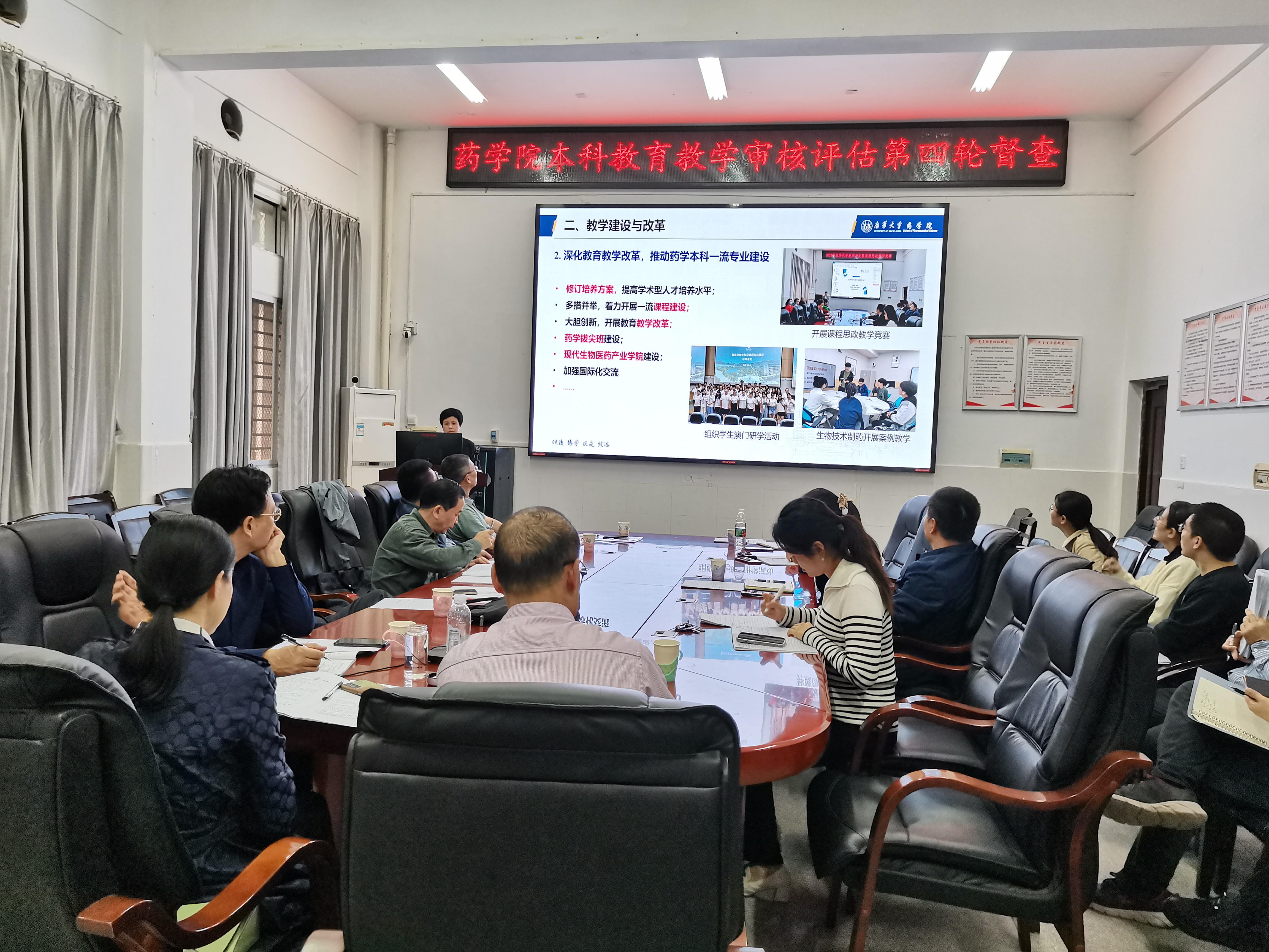 督查组由柯国军、肖锡林、赵飞骏、余修武、赵宇红、肖方竹、李忆华、阳鹏飞等专家组成。按照安排,专家首先听取了易岚的汇报,易岚从学院概况、教学建设与改革、典型案例、下一步打算等四个方面汇报了我们学院本科教育教学审核评估工作的进展情况。随后,督查组专家认真细致检查了我院本科教育教学审核评估有关材料。重点进行了模拟访谈,督查了《学校下一步整改工作安排》落实情况、组织学习情况、网页更新质量、宣传报道和氛围、抽查的教学文件质量、规章制度汇编等情况,并逐一进行指导。整体看来,我院领导高度重视审核评估工作,各项工作井然有序、稳步推进,学院各部门积极配合,尤其是网页更新质量、宣传报道和氛围等受到督查组的一致好评,当然,专家也指出我们学院在教研室层面组织学习的资料不够完善等方面还有提升空间。