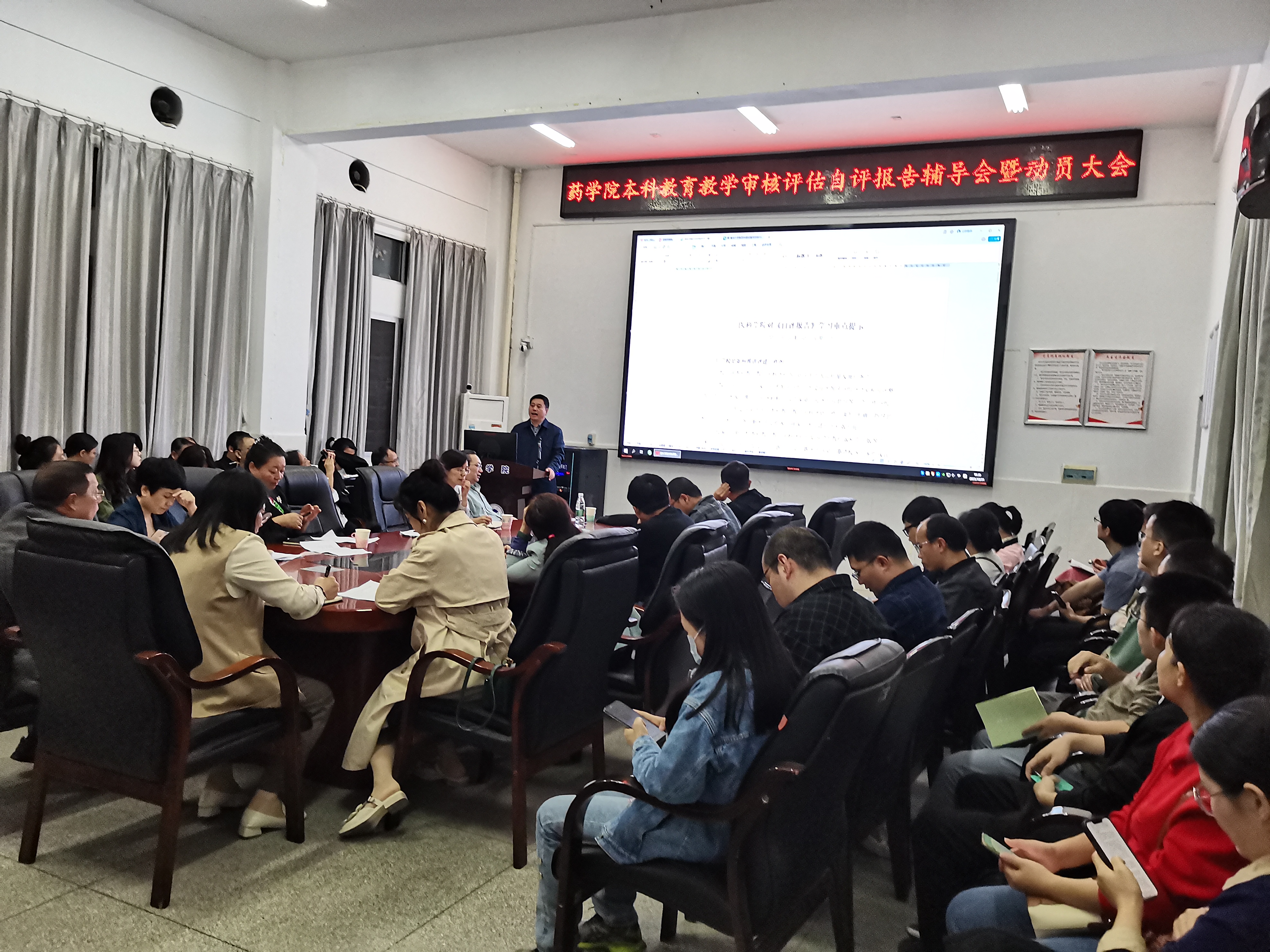 10月31日晚上7:30,我院在药学楼B101会议室召开新一轮本科教育教学审核评估自评报告辅导会暨动员大会。PA视讯集团官网院长喻翠云、党委书记袁中华、副书记陈健平、副院长易岚、副院长王力立以及学院全体教职员工参加了此次动员大会,会议由学院党委书记袁中华主持。